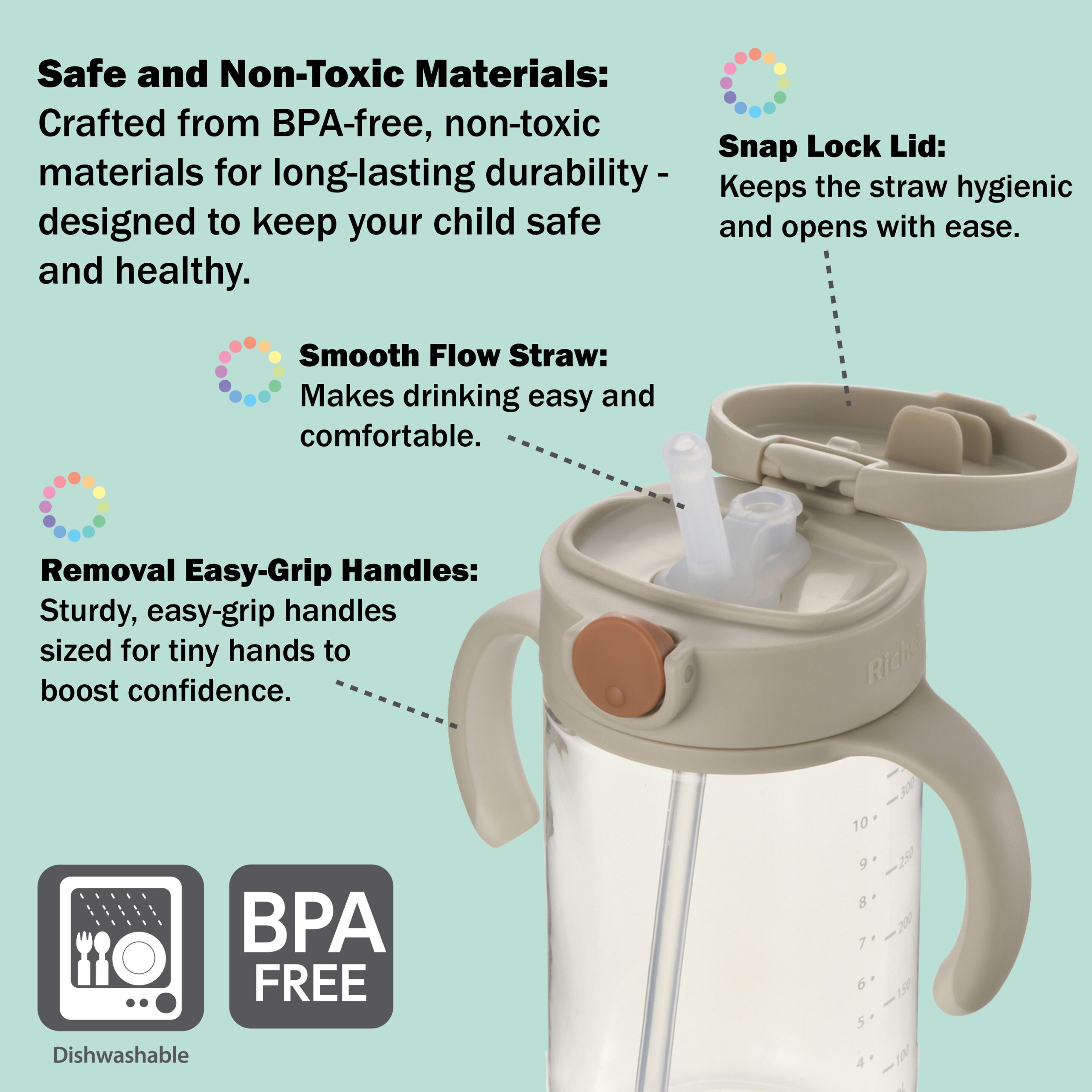 - Easy-Grip Handles: The sturdy, easy-grip handles are perfectly sized for tiny hands, helping your toddler gain confidence and independence while drinking.